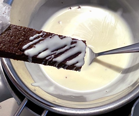 ④のボウルに③のガトーショコラを逆さまにしてチョコをつけます。(または、スプーンでチョコを線描きします。)※途中でチョコが固まってきたら再び湯せんにかけてください。