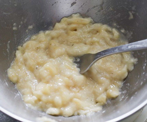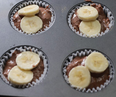 ①のボウルに③を入れて、泡だて器で混ぜて粉っぽさがなくなったら型に入れて、バナナ(トッピング)を輪切りにしてのせ、170℃20分焼きます。