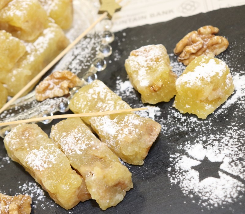 ⑤に茶こしで粉糖(ノンウェットシュガー)をふりかけてから、型から外し、一口大に切り分け、全体に粉糖(ノンウェットシュガー)をまぶします。