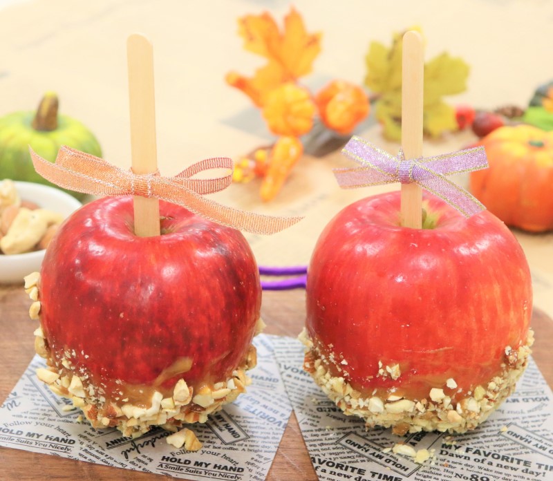 - りんごはよく洗い、しっかりと水気をふいて棒(または竹串・割り箸など)を刺して、冷蔵庫で冷やしておきます。※冷やしておくことで、キャラメルコーティングが固まりやすくなります。