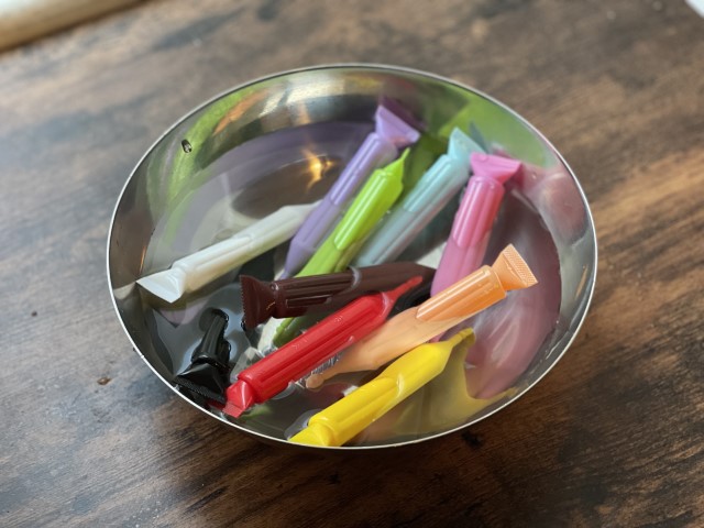 小ビニール袋を使えばデコペンから詰め込むだけ。手っ取り早いです。