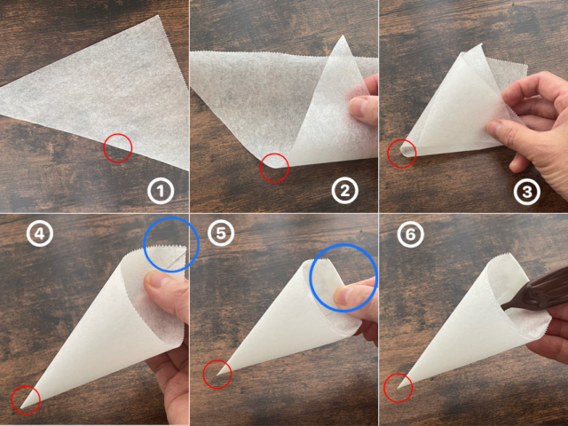 ①三角形または二等辺三角形にカットしたオーブンシート(OPPシート)の、一番長い辺の中心を決め、そこが絞り出す部分とします。写真では赤丸で囲んでいます。