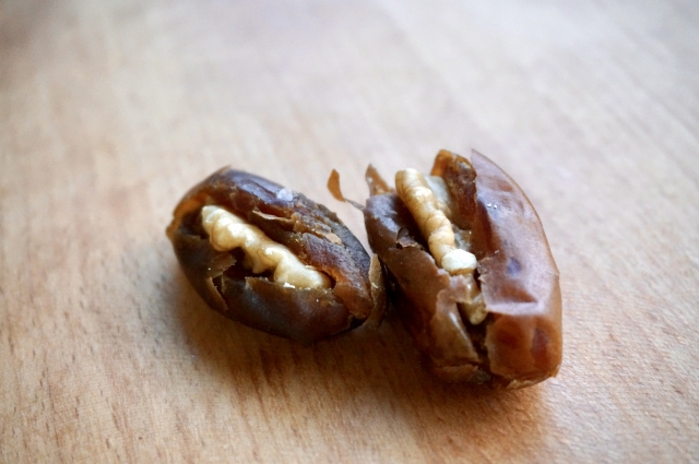 デーツに包丁で切り込みを入れて種を除き、クリームチーズやくるみをはさみます。クリームチーズのコクやくるみのサクッとした食感がデーツの濃厚な甘さとよく合います。