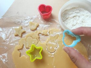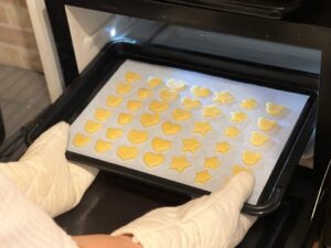 抜き型で抜いた生地は、一旦冷蔵庫(冷凍庫)で30分ほど冷やすと良いですよ。