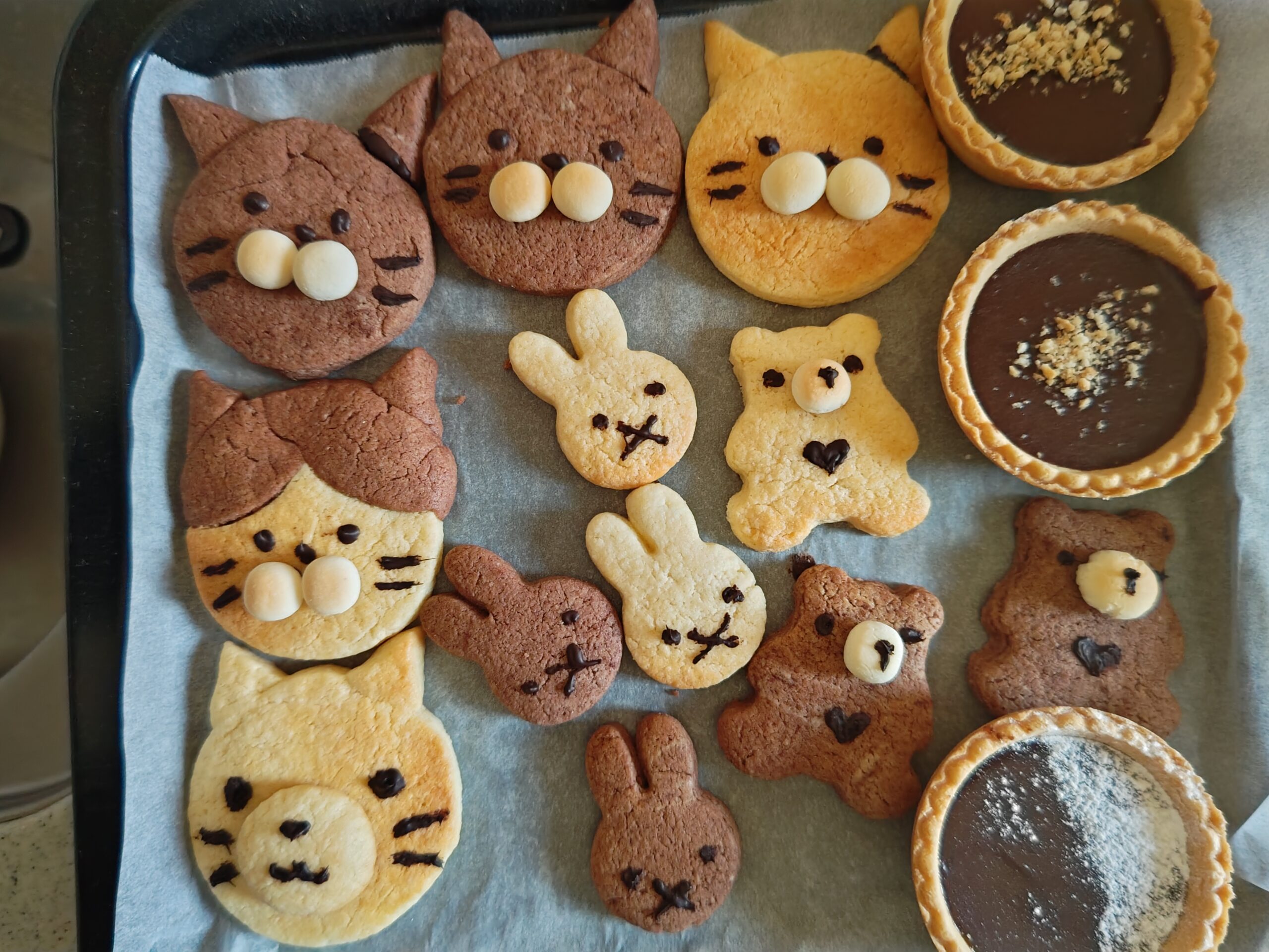 家族にバレンタインに作りました!真ん中上が娘、左下は私、右下が夫です。1歳半になる娘の髪の毛はこんな感じです…! 米粉のクッキーに顔をつけて焼いた後、チョコレートをつけて髪の毛にしました!(おじいちゃんやおばあちゃんには髪の毛の色にあわせて、ホワイトチョコで作ってみてもよいかもしれません!) 米粉クッキーの材料は、米粉、ピーナッツバター、きび砂糖、豆乳、塩です。ピーナッツバターの香ばしさとチョコレートがマッチしておいしいです!