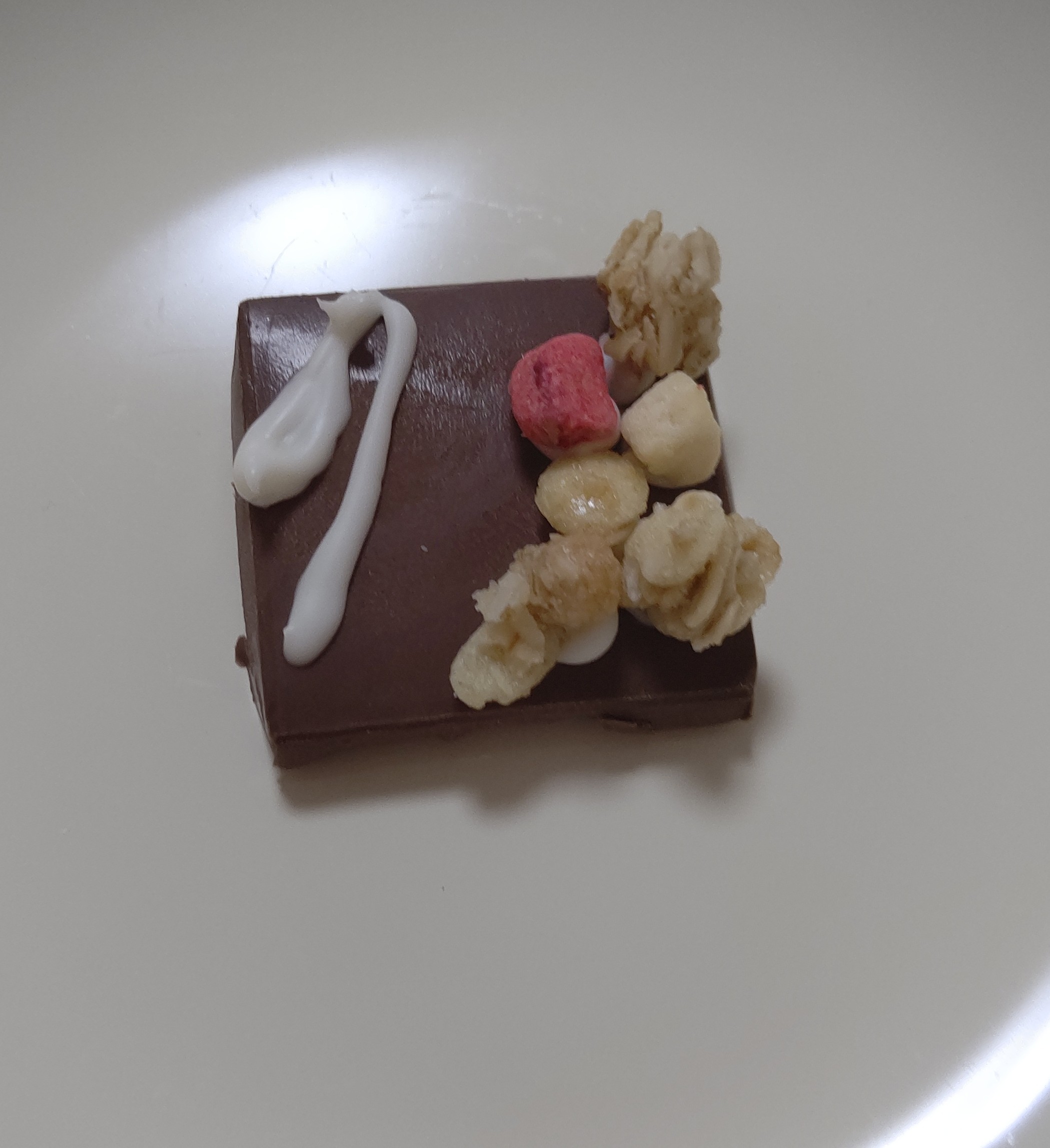板チョコを溶かして四角の型にチョコを流して冷やし固めました。その後にデコペンホワイトで線を書きました。デコペンをのり替わりにして絞った上からシリアルを乗せて完成‼️シリアルがサクサクしててチョコと相性があって美味しかったです。 見た目も上手くいったので嬉しいです。
