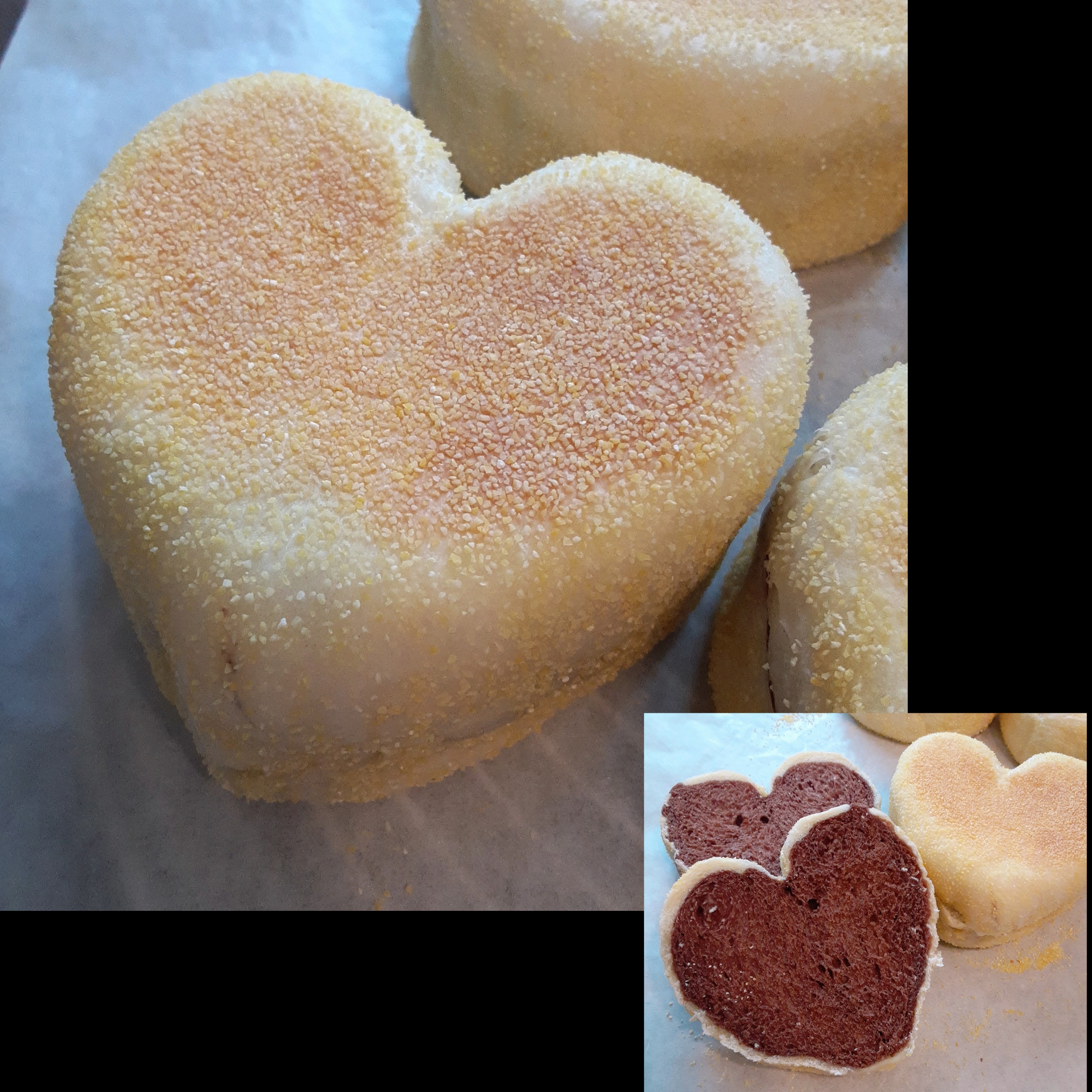 牛乳パックで手作りしたハートのセルクルを使って焼きました(*^^*) 外側は普通生地、なかは、ココア生地に! 白いプレーン生地を二等分にして、1つにハートの窪みを作ったら、そこに雫形に成形したココア生地を置き、もう1つのプレーン生地で蓋をして包み込んでます。生地の割合はプレーン、ココア生地5:3くらいです。Wハートに子供達も大喜びでした☆彡