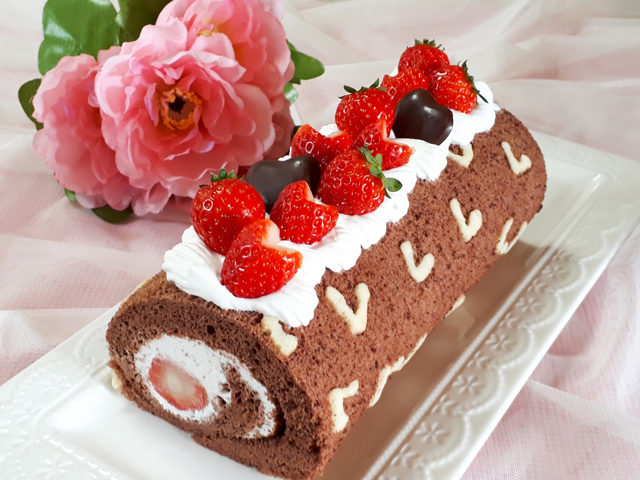 少し苦めのココア生地に、濃厚ショコラホイップと自分で摘んできたいちごをサンド。マカロンもトッピングで可愛さアップ♡ バレンタインにぴったりのケーキができました♪