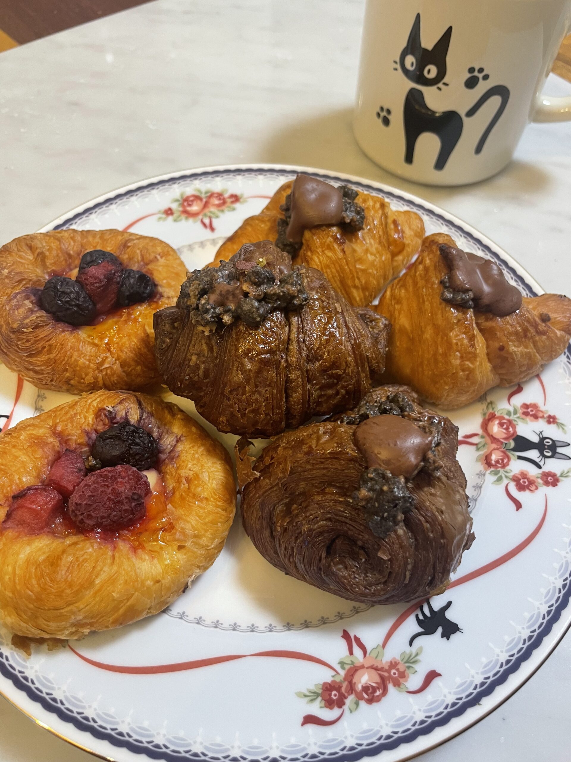 ミニサイズで食べやすく、3種類の味を楽しめるようにしました!バターの香り高いサクサクの生地にチーズクリームの酸味とベリーの甘酸っぱさが美味しいデニッシュとチョコを巻き込んだミニクロワッサン、ココア生地のチョコクロワッサンは上にチョコクッキーを砕き、溶かしたチョコも乗せて食感と甘すぎないチョコがマッチしています♪