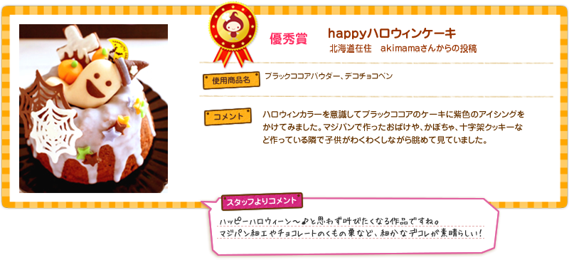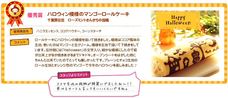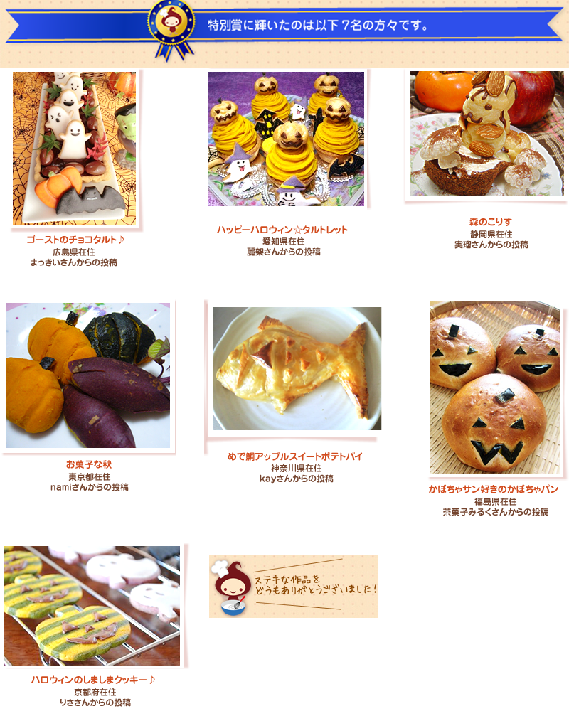 今回もアイデアたっぷりの作品を多数ご応募いただきまして、ありがとうございました。秋の味覚がたっぷり詰まった素敵な作品ばかりでした。 秋は過ごしやすい季節、そして食欲の秋という事で旬のお菓子を作りたくなりますね。 そして来月は、いよいよクリスマス!共立食品でもクリスマス特集ページを予定しております。皆さまのクリスマスメニューにお役立ていただければ幸いです。