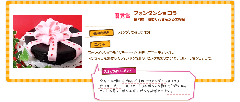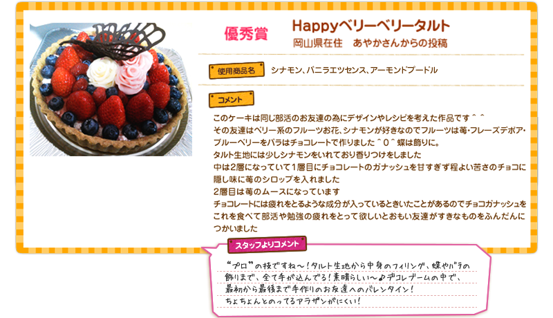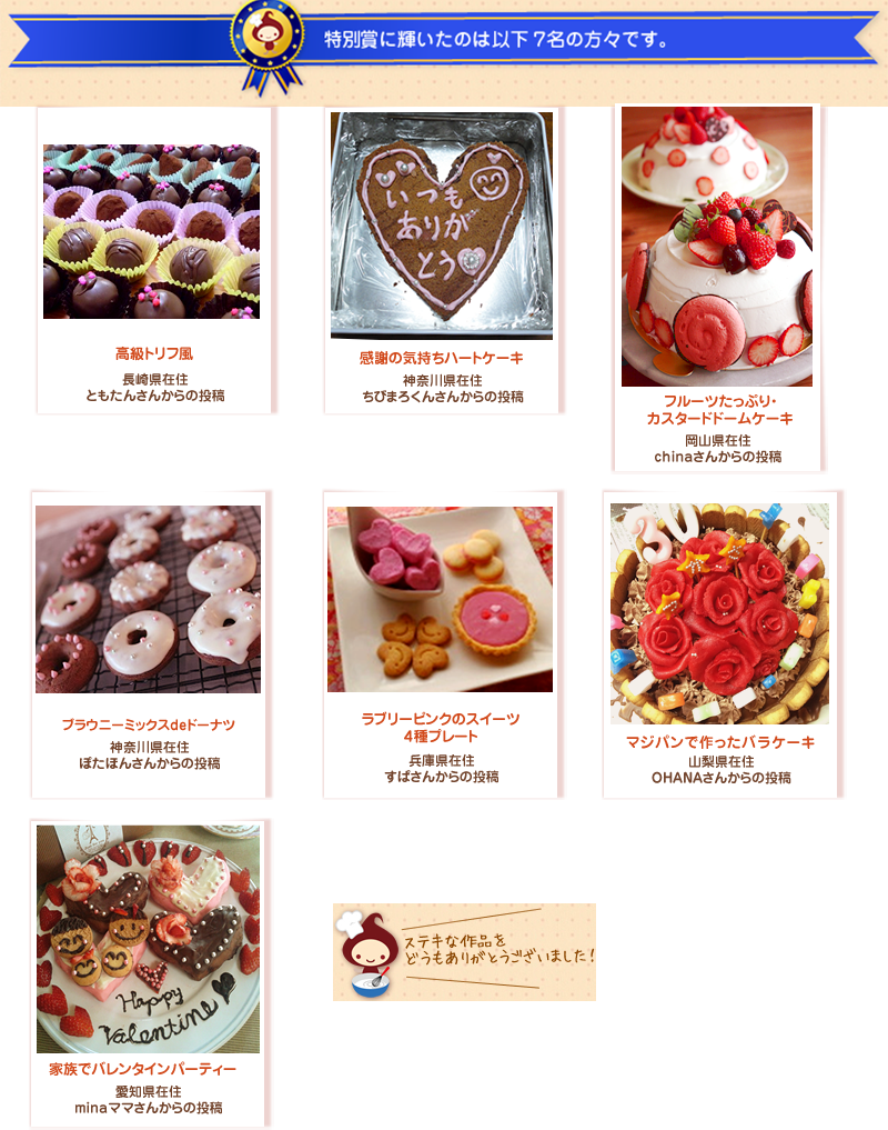 毎年、バレンタインスイーツコンテストは「今年は皆さん、どんなものを作るのかな?」「ダレにプレゼントするのかな?」…などなど、その年の傾向もワクワク楽めるコンテストなのです。ありがとうございます!