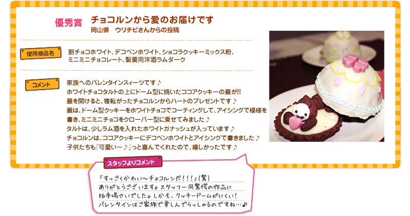 またまたお楽しみなコンテストが終わってしまいました(涙)毎年、バレンタインスイーツコンテストは「今年は皆さん、どんなものを作るのかな?」「ダレにプレゼントするのかな?」…などなど、その年の傾向もワクワク楽めるコンテストなのです。ありがとうございます! 今年もアイディアあふれる作品ばかりで、楽しく拝見させて頂きました。昨年はかなりハデめなデコレチョコが多かったような気がしましたが、今年は中身とアイディアで勝負!!的な作品がたくさん見受けられました。 さあ、次は「手作りパンコンテスト」!どしどしご応募お待ちしております~♪