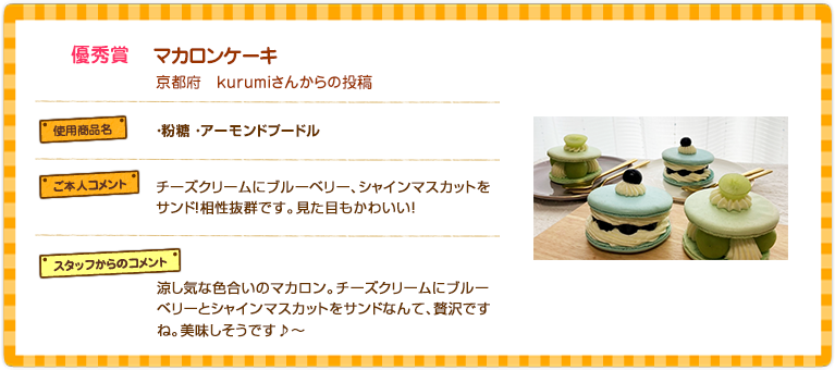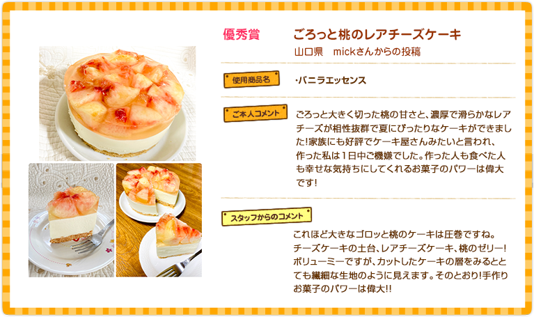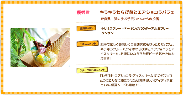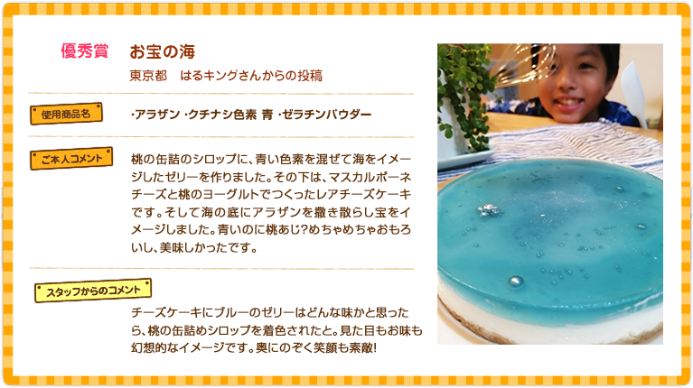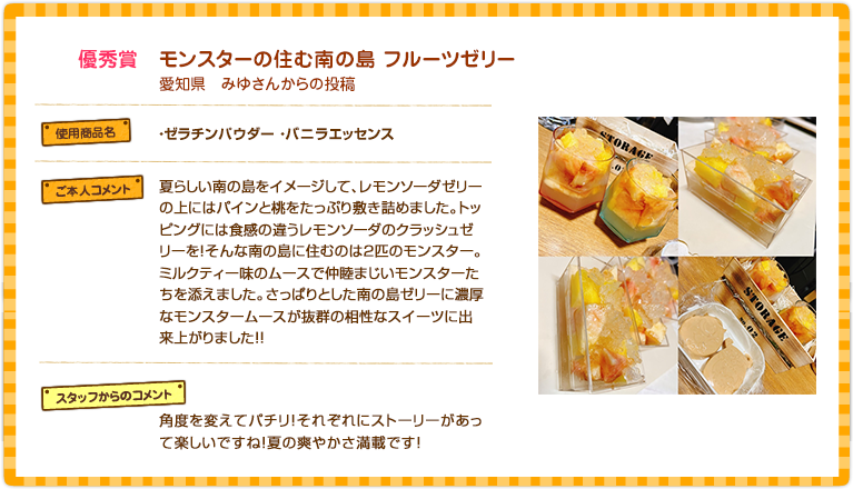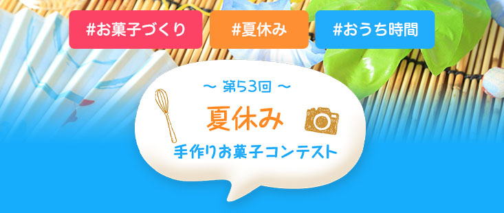 第53回夏休み手作りお菓子コンテストの発表です。今回もたくさんのご応募をいただき、ありがとうございました。今年の夏は猛暑!しかしながら、旬の果物を使ったり、涼し気なデザートだったりとアイディア作品目白押しでした。さて、優秀賞の発表です♪~
