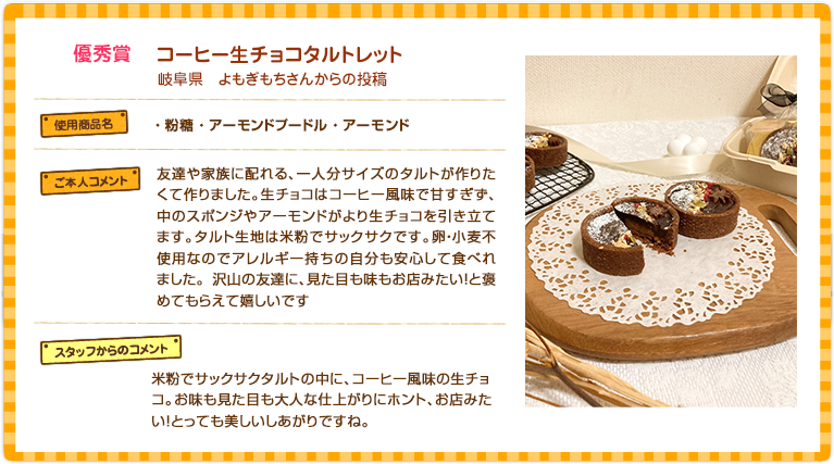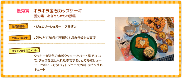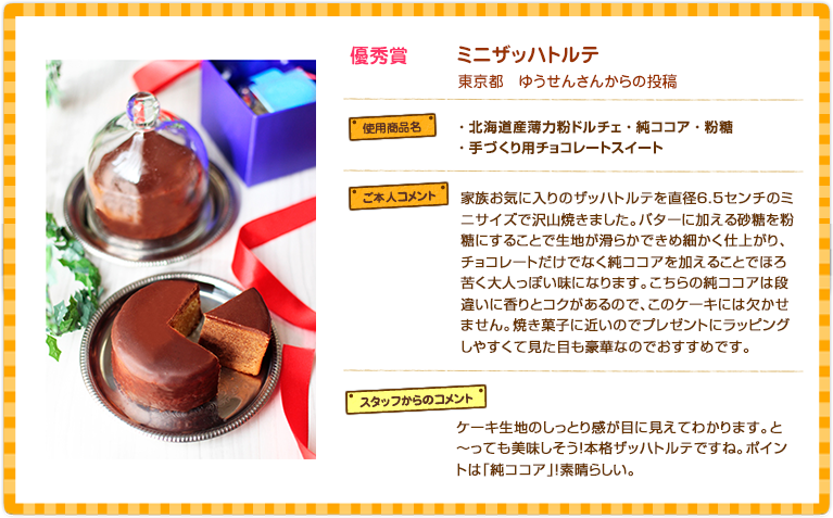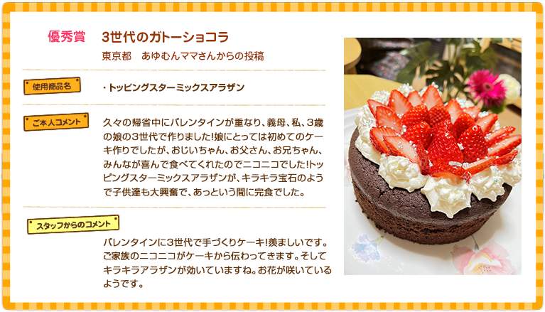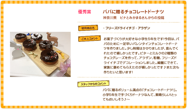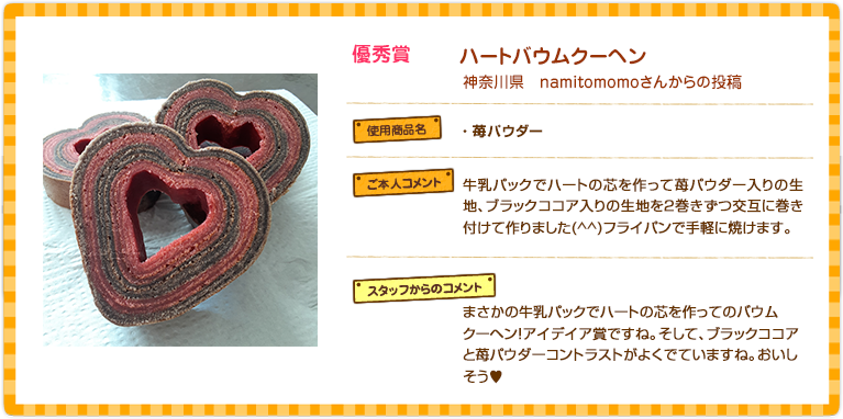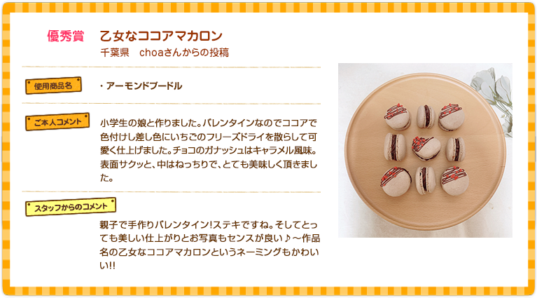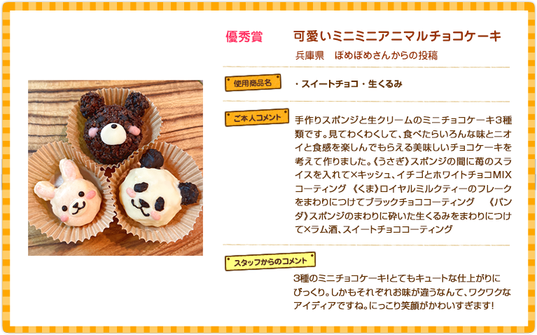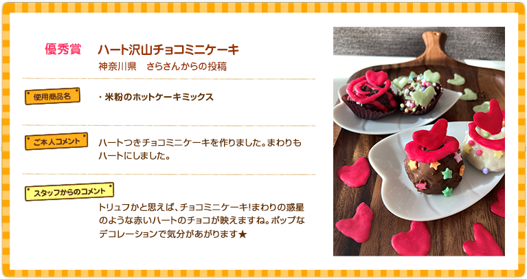 今回も思い思いの手づくりスイーツと楽しいコメントをたくさん投稿いただき、ありがとうございました!昨年はおうちで楽しむバレンタインのようでしたが、今年は贈る方も多かったような気がします。さて、第56回バレンタインコンテスト優秀賞の発表です。