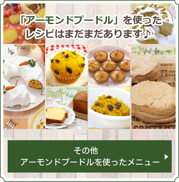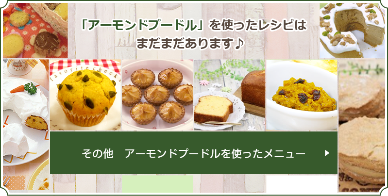 クッキー、フィナンシェ、マフィンなどの焼き菓子の生地に練り込むと、小麦粉と違った“アーモンド”の風味やコクが出ます。アーモンドプードルはグルテンがないので、クッキー類はサクサクにパウンドケーキやマフィンなどはアーモンドの脂分によりしっとり感が出てきます。