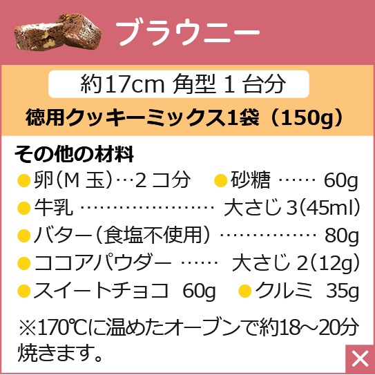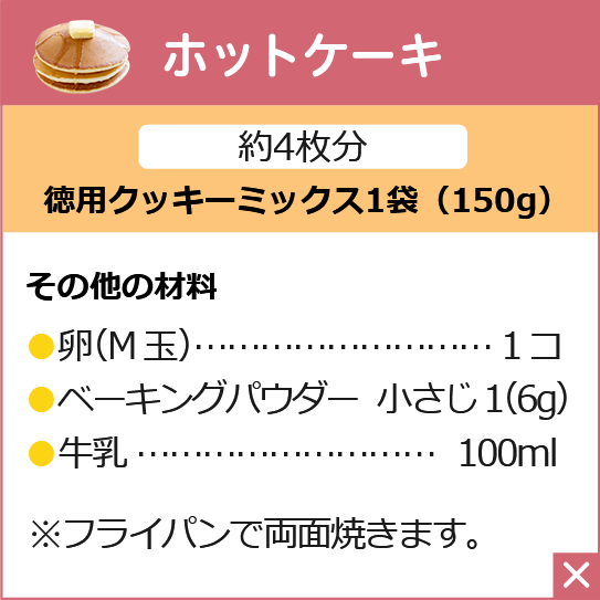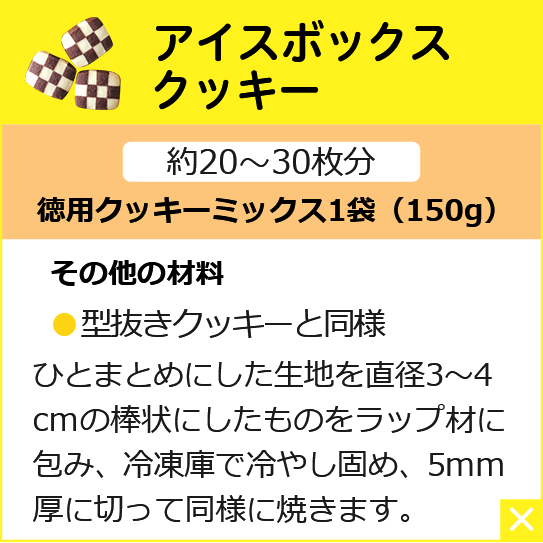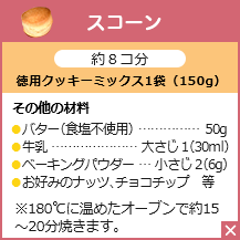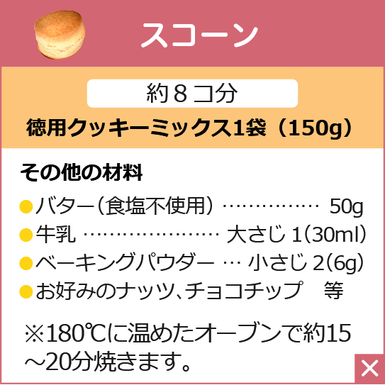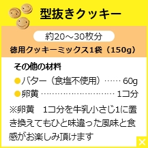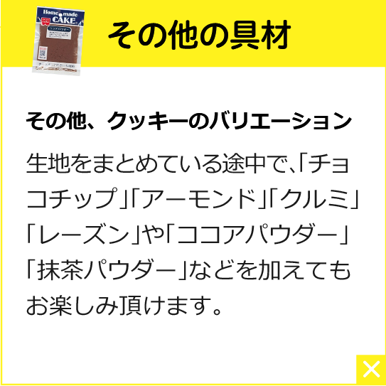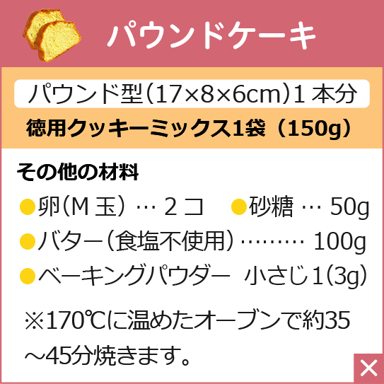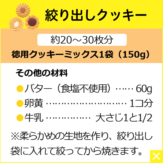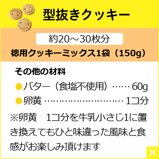 徳用クッキーミックス サクッとした食感のクッキーが手軽に作れるミックス粉です。1回分ずつの便利な小分けタイプなので無駄なく使えます。 クッキーミックスなのに、サクサククッキー以外にもふんわりスイーツなど色々作れるミックスです。 「クッキー」バリエーションはもちろん、ミックス粉をベースとしたその他のメニューも応用ができる便利なミックスです。 パウンドケーキ ホットケーキ ブラウニー スコーン タルト 等 1袋150g無駄なく使えて便利です。 たっぷり使える4袋入りで毎日のおやつも豊富なメニューを作れます!