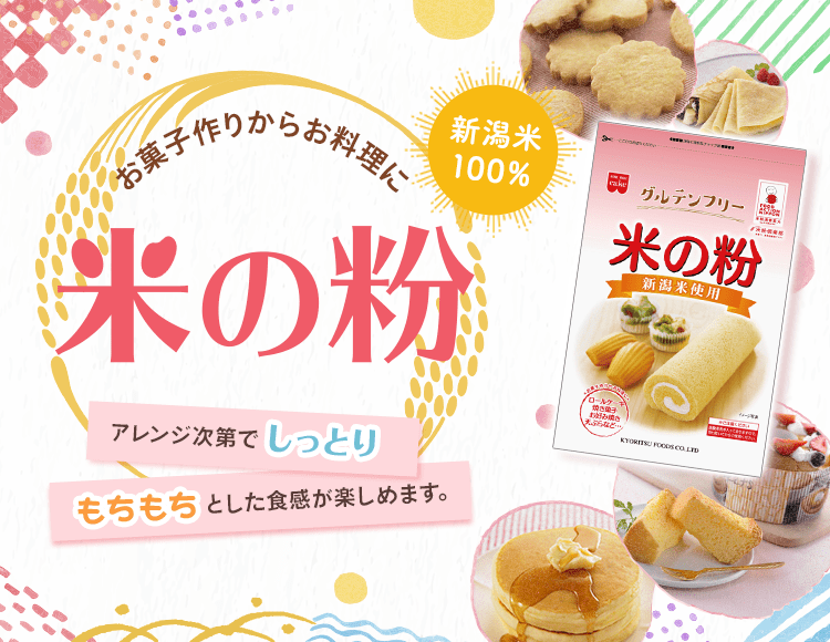 - 粉以外の副材料(バター、卵、牛乳等)が入るようなレシピの場合、薄力粉をそのまま「米の粉」に置き換えても問題なく作れる場合もございますが、「米の粉」は薄力粉とは性質が異なりますので、薄力粉のレシピを使用する場合、まずは薄力粉の3~5割を「米の粉」に置き換えてみてください。お料理系は大抵問題ないと思います。その都度水分量の調整をしてください。