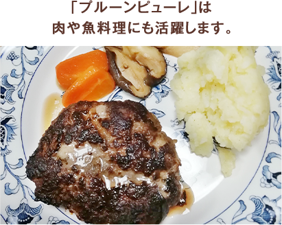 - ハンバーグ生地にプルーンピューレを5~10%ほど入れて練り込むと更にジューシーにコクのある味に仕上がります。その他、カレーや照り焼きの隠し味などにお試しください。