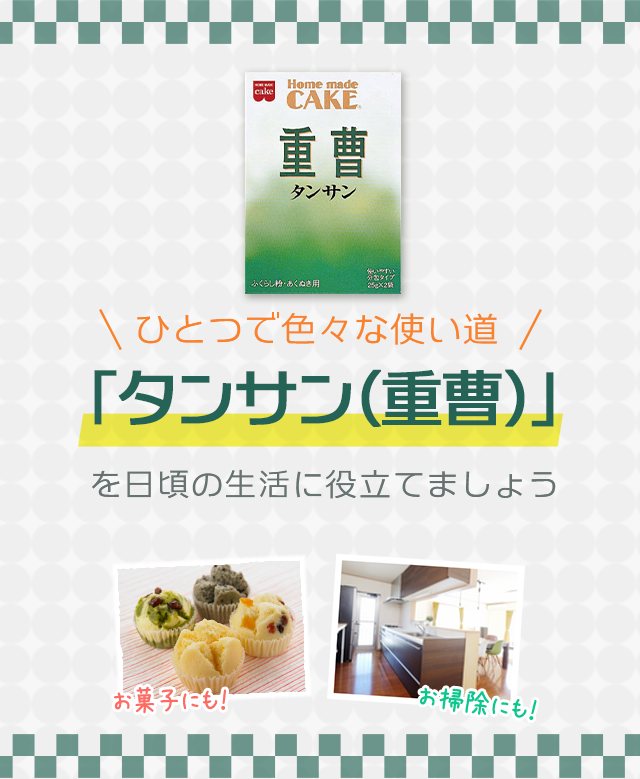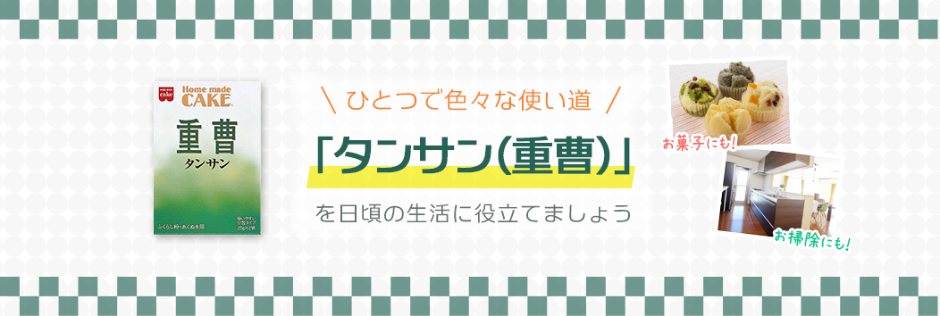 基本的には「ふくらし粉」として使われてきましたが、最近はタンサン(重曹)の安全性や効果が注目され「食」としてではなく、色々な場面で活用されるようになりました。