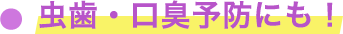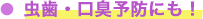 コップ一杯の水に小さじ1/2程の重曹を混ぜ、口に含んでうがいをすれば、食べかすなどで酸性になった口内を中和し、虫歯予防や口臭予防になります。
