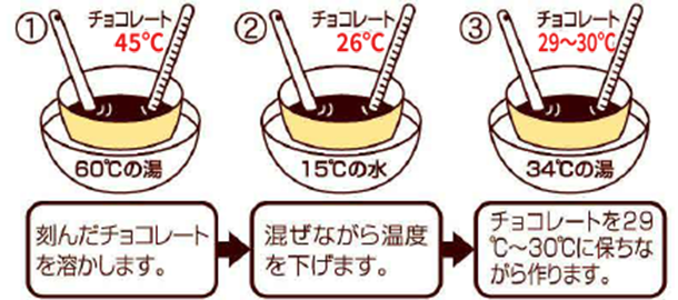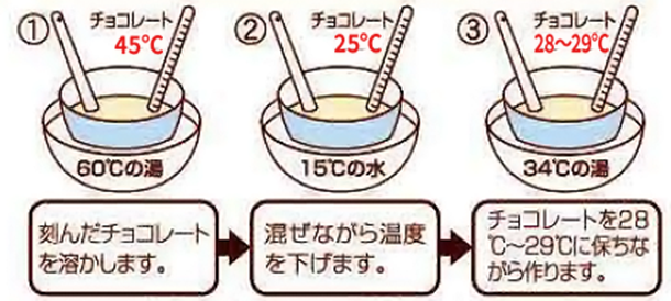チョコレートの結晶を最も安定した状態にする温度調整のこと チョコレートの数種類の異なった分子を、温度を上げ溶かすことで一度バラバラにし液状化。 その分子を再びまとめる為、温度を下げて整え、最も分子が安定する温度まで再び上げます。 こうする事で最も口溶けなめらかなつやのよい美味しいチョコレートが出来上がります。