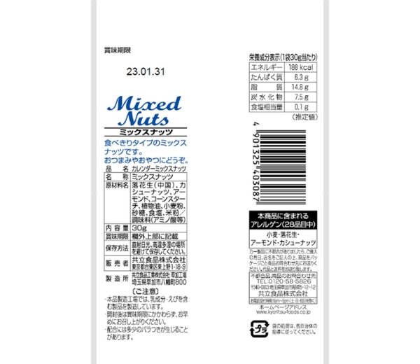 1袋(30g)当たり:エネルギー188kcal、たんぱく質6.3g、脂質14.8g、炭水化物7.5g、食塩相当量0.1g (推定値) |