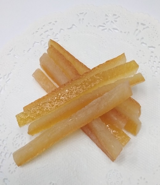糖付けのオレンジの皮をスティック上にカットしました。そのままチョコレートをかけたり、刻んで焼き菓子に練り込んだりと幅広くお使いいただけます。 |