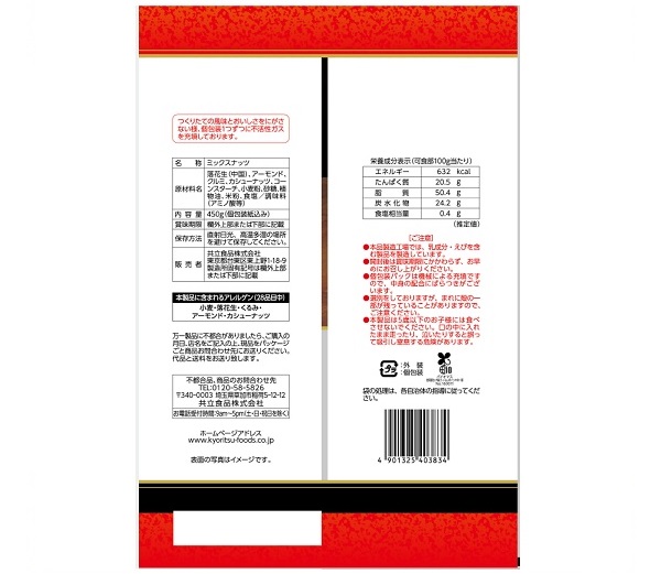 落花生(中国)、アーモンド、クルミ、カシューナッツ、コーンスターチ、小麦粉、砂糖、植物油、米粉、食塩/調味料(アミノ酸等) |
