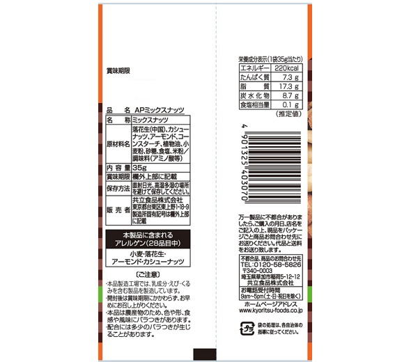 1袋35g当たり:エネルギー220kcal、たんぱく質7.3g、脂質17.3g、炭水化物8.7g、食塩相当量0.1g (推定値) |