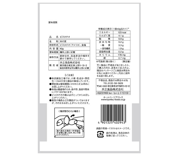 1袋40g当たり:エネルギー123kcal、たんぱく質4.1g、脂質9.9g、炭水化物5.2g(糖質3.3g、食物繊維1.9g)、食塩相当量0.2g、カリウム178mg、鉄0.7mg ※可食部(殻は除く) |