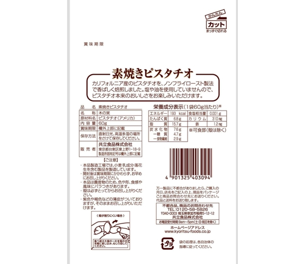 1袋60g当たり:エネルギー193kcal、たんぱく質6.8g、脂質15.7g、炭水化物7.6g(糖質4.7g、食物繊維2.9g)、食塩相当量0.001g、カリウム310mg、鉄1.2mg ※可食部(殻は除く) |