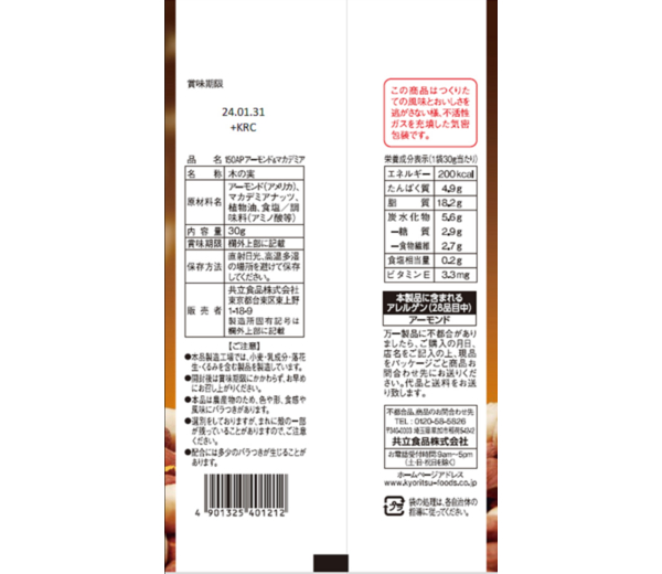 1袋30g当たり:エネルギー200kcal、たんぱく質4.9g、脂質18.2g、炭水化物5.6g(糖質2.9g、食物繊維2.7g)、食塩相当量0.2g、ビタミンE 3.3mg |