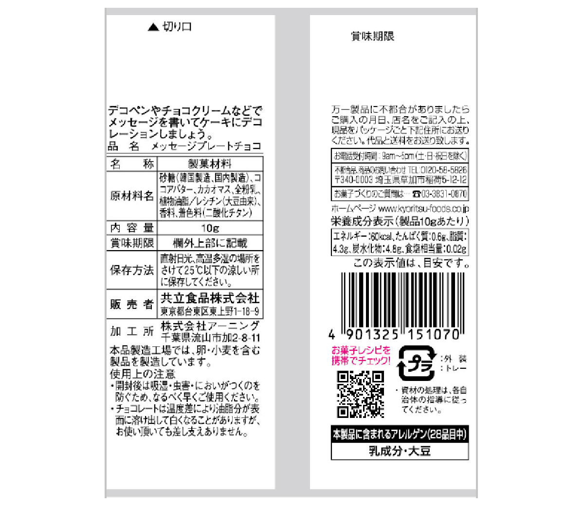 砂糖(韓国製造、国内製造)、ココアバター、カカオマス、全粉乳、植物油脂/レシチン(大豆由来)、香料、着色料(二酸化チタン) |