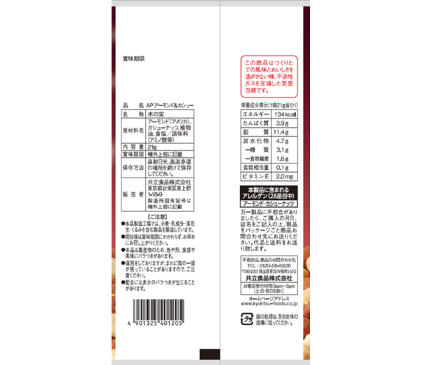 アーモンド(アメリカ)、カシューナッツ、植物油、食塩/調味料(アミノ酸等) |