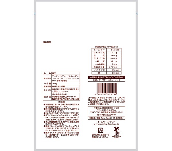 1袋(100g当たり):エネルギー512kcal、たんぱく質11.7g、脂質33.0、炭水化物45.0g、-糖質39.1g、-食物繊維5.9g、食塩相当量0.009g、ビタミンE6.5mg、鉄3.2mg |