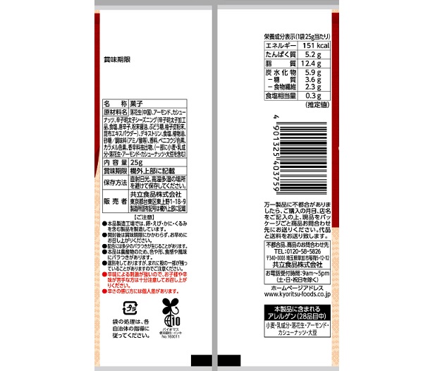 落花生(中国)、アーモンド、カシューナッツ、辛子明太子シーズニング(辛子明太子加工品、食塩、唐辛子、粉末醤油、ぶどう糖、柚子皮粉末、昆布エキスパウダー)、デキストリン、食塩、植物油、砂糖/調味料(アミノ酸等)、香料、ベニコウジ色素、カラメル色素、香辛料抽出物、(一部に小麦・乳成分・落花生・アーモンド・カシューナッツ・大豆を含む) |