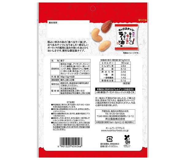 落花生(中国)、アーモンド、カシューナッツ、植物油、食べるラー油シーズニング、食塩/調味料(アミノ酸等)、(一部に小麦・落花生・アーモンド・カシューナッツ・大豆・ごまを含む) |