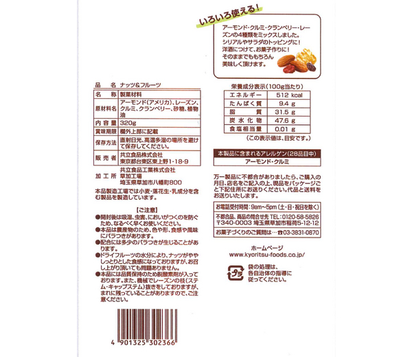アーモンド(アメリカ)、レーズン、クルミ、クランベリー、砂糖、植物油 |