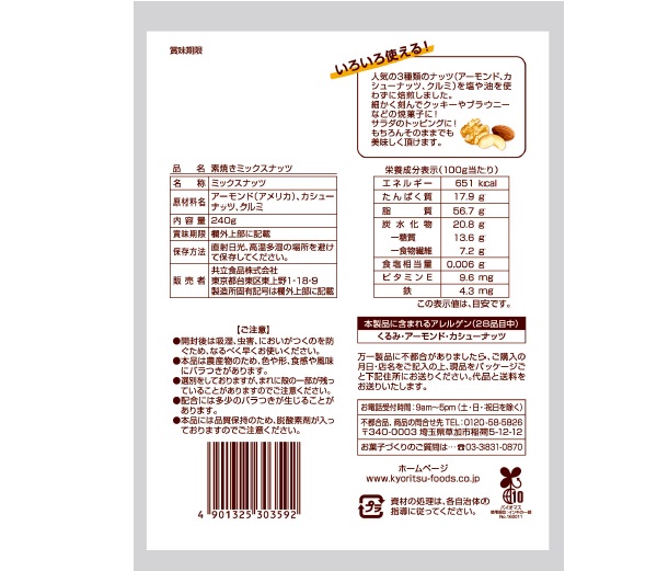 アーモンド、カシューナッツ、クルミの3種類のナッツを塩や油を使わずに焙煎した素焼きのミックスナッツです。 細かく刻んでクッキーやブラウニーなどの焼菓子に!サラダに添えても!素焼きなので、もちろんそのままでも美味しく頂けます。