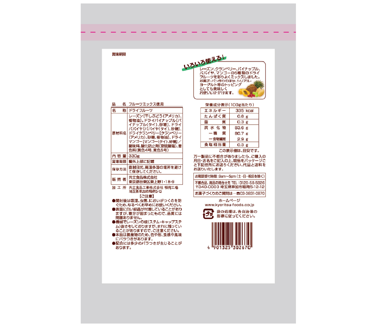 レーズン[干しぶどう(アメリカ)、植物油]、ドライパイナップル[パイナップル(タイ)、砂糖]、ドライパパイヤ[ドライパパイヤ(タイ)、砂糖]、ドライクランベリー[クランベリー(アメリカ)、砂糖、植物油]、ドライマンゴー[マンゴー(タイ)、砂糖]/酸味料、酸化防止剤(亜硫酸塩)、着色料(黄色4号、黄色5号) |