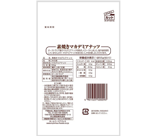 1袋55g当たり:エネルギー409kcal、たんぱく質4.0g、脂質40.6g、炭水化物9.0g(糖質4.8g、食物繊維4.2g)、食塩相当量0.004g、オレイン酸24.8g、パルミトレイン酸6.3g |