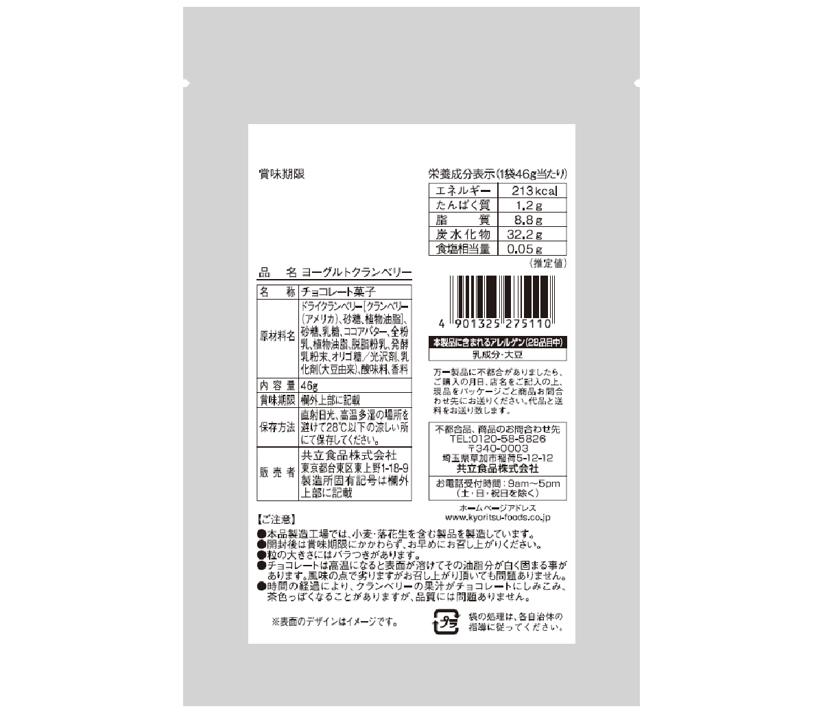 ドライクランベリー[クランベリー(アメリカ)、砂糖、植物油脂]、砂糖、乳糖、ココアバター、全粉乳、植物油脂、脱脂粉乳、発酵乳粉末、オリゴ糖/光沢剤、乳化剤(大豆由来)、酸味料、香料 |