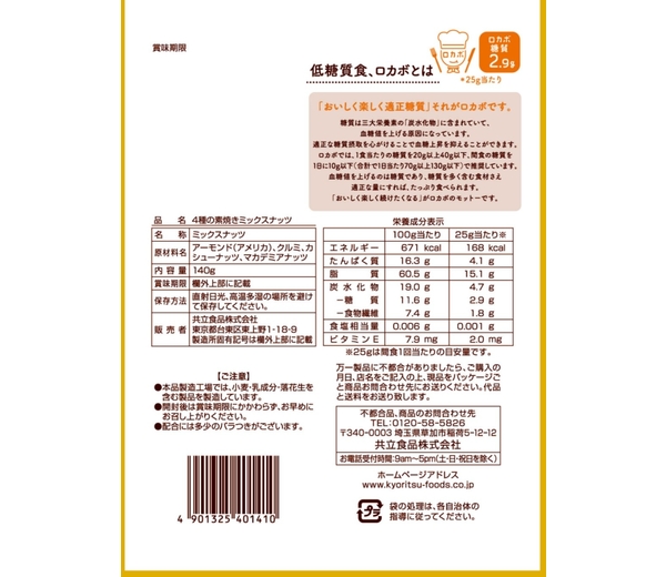 素焼きのアーモンド、クルミ、カシューナッツ、マカデミアナッツ をバランスよくミックスしました。食塩、植物油不使用なので素材の味を存分にお楽しみ頂けます。 ロカボ【おいしく楽しく適正糖質】 ・・・・・・・・・・・・・・・・・・・・・・・・・・・・・・・・・・・・・・・・ |