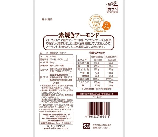 ●1袋80g当たり:エネルギー501kcal、たんぱく質17.3g、脂質43.0g、炭水化物15.2g(糖質7.0g、食物繊維8.2g)、食塩相当量0.002g、ビタミンE16.3mg、鉄3.3mg |