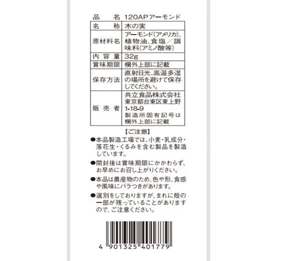 アーモンド(アメリカ)、植物油、食塩/調味料(アミノ酸等) |
