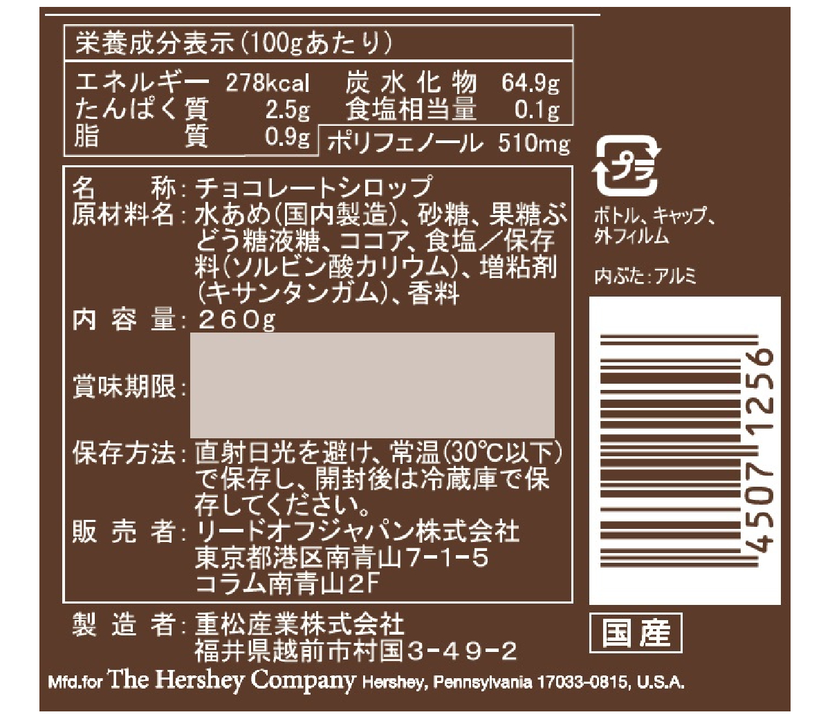 水あめ(国内製造)、砂糖、果糖ぶどう糖液糖、ココア、食塩/保存料(ソルビン酸カリウム)、増粘剤(キサンタンガム)、香料 |