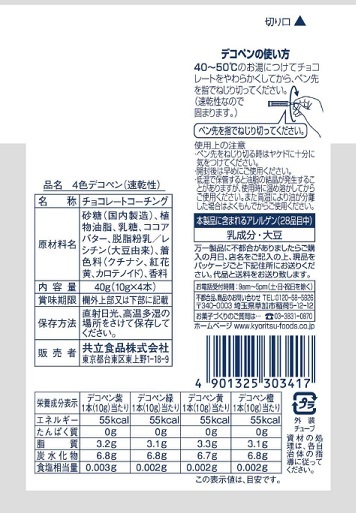 ・ペン先をねじり切る時はヤケドに十分に気をつけてください。 ・開封後は早めにご使用ください。 ・低温で保管すると油脂の結晶が発生することがありますが、使用時に温め溶かしてからご使用ください。また高温により油が分離した場合は、よくもんでからご使用ください。 |