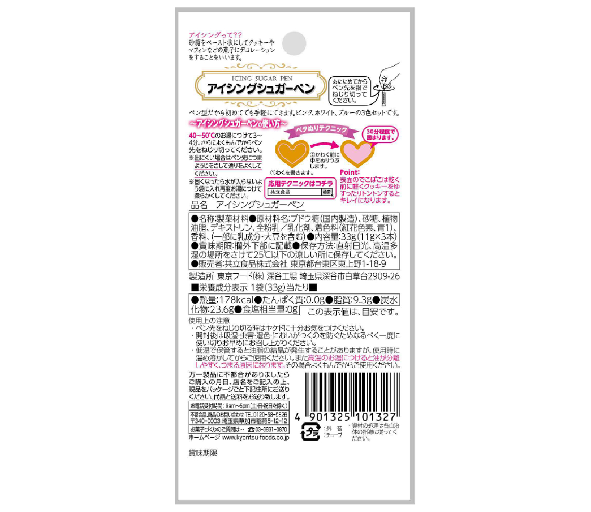 「アイシング」とは砂糖をペースト状にしたものです。これがペン型の容器に入りました! 3本で5cmクッキー約12コ分のベタぬりができます。 |