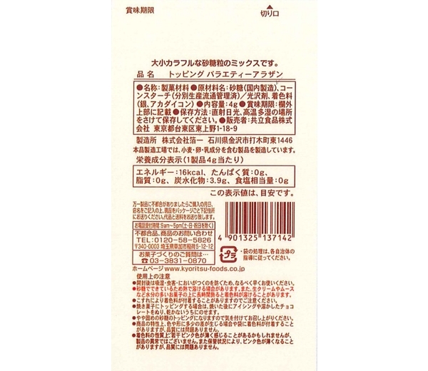 砂糖(国内製造)、コーンスターチ(分別生産流通管理済)/光沢剤、着色料(銀、アカダイコン) |