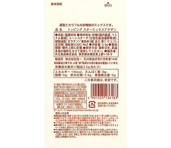 砂糖(国内製造、ベトナム製造)、コーンスターチ(分別生産流通管理済)、植物油脂、ゼラチン/着色料(銀、赤3、青1、ウコン)、光沢剤、増粘剤(CMC-Na)